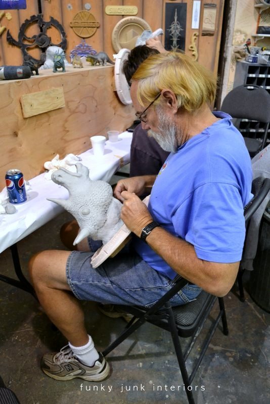 Lyn, I’ll reveal more when you see the photos. In a nutshell, he’s creating a dinosaur head. 🙂