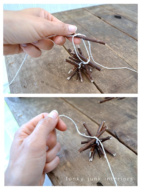 6. Continue adding twigs and knotting them tightly until you run out of string.