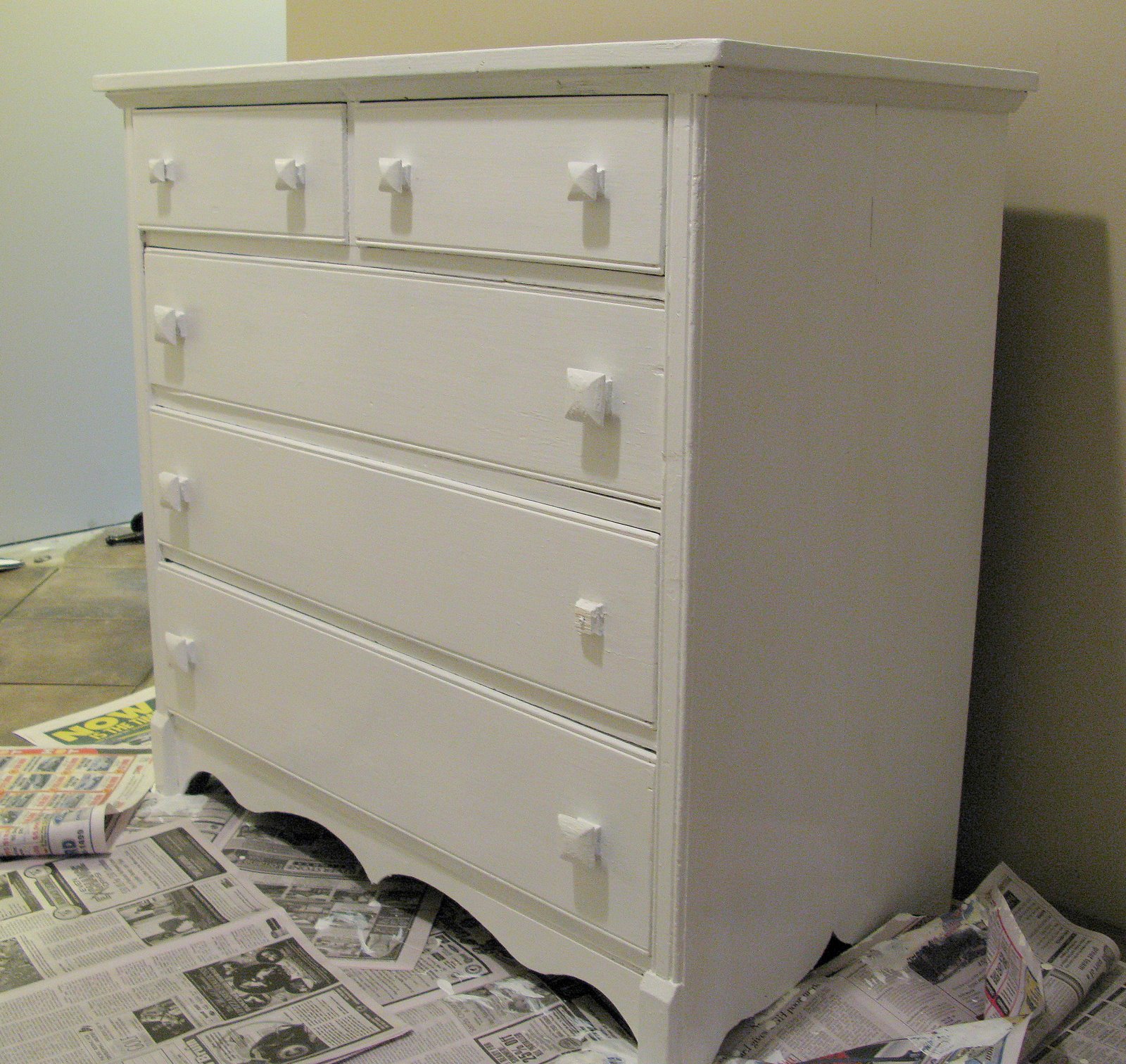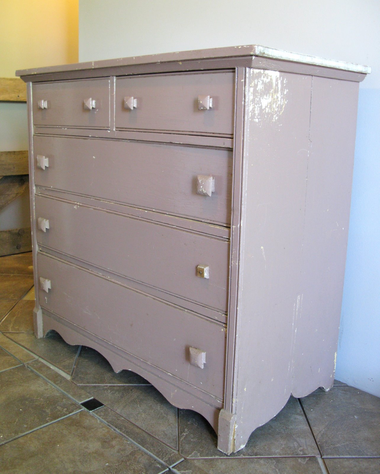 My salvaged $5 dresser from someone’s barn in some weird shade of pink…