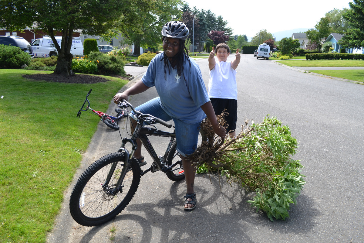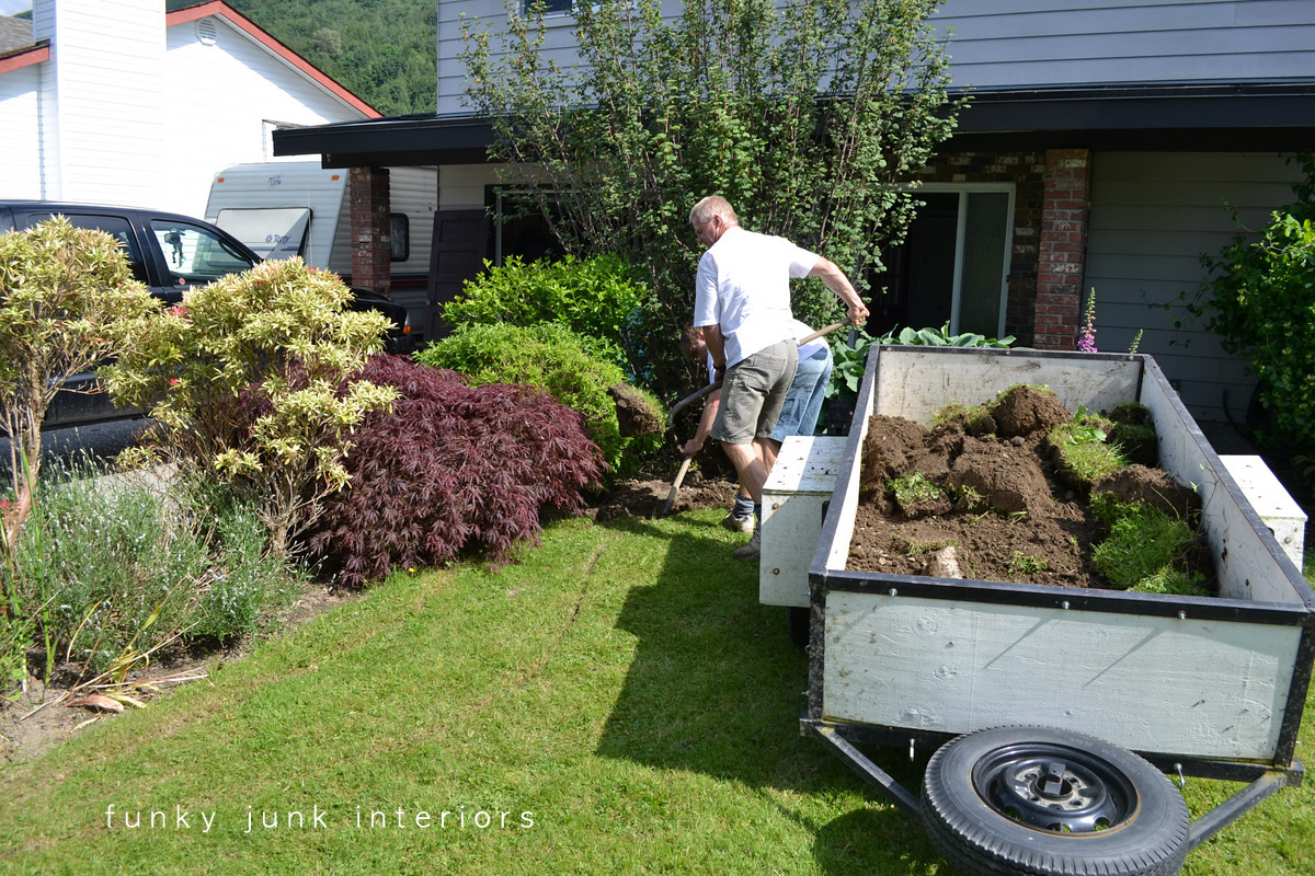 In order to create a new shape for the flowerbeds, a half moon edger, a generous neighbour Rudy and sons Lucas and Kenny, plus their trailer did the trick!