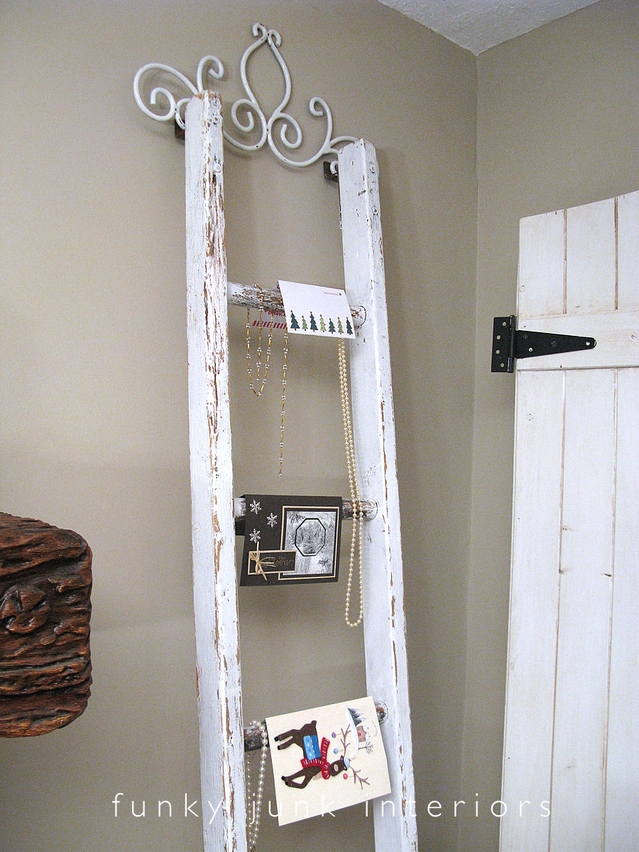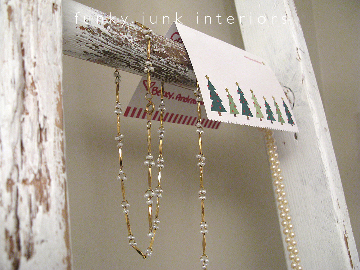 Special pieces from my mom’s jewelry box sparkle up this little rustic card display.