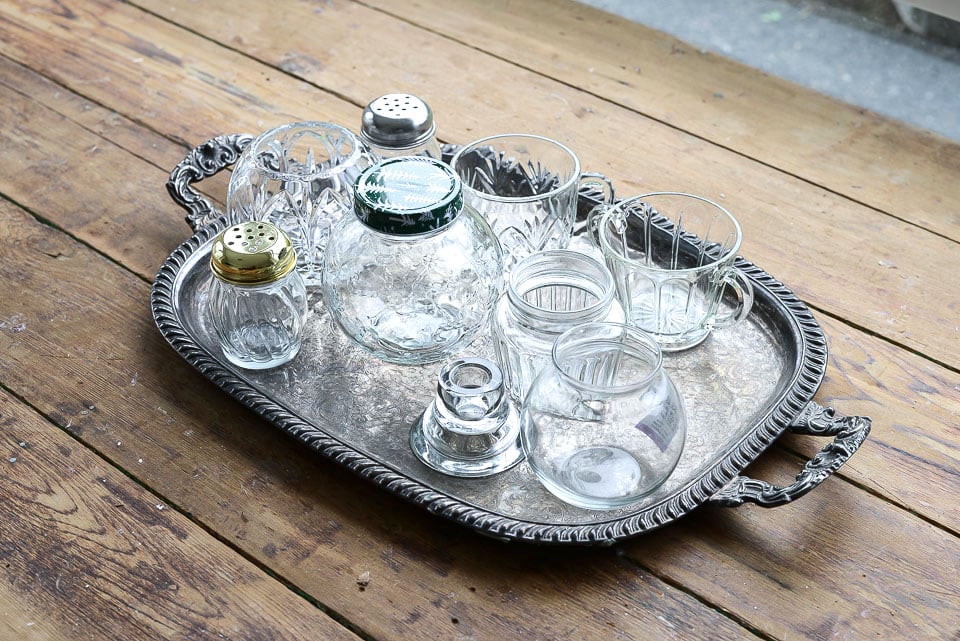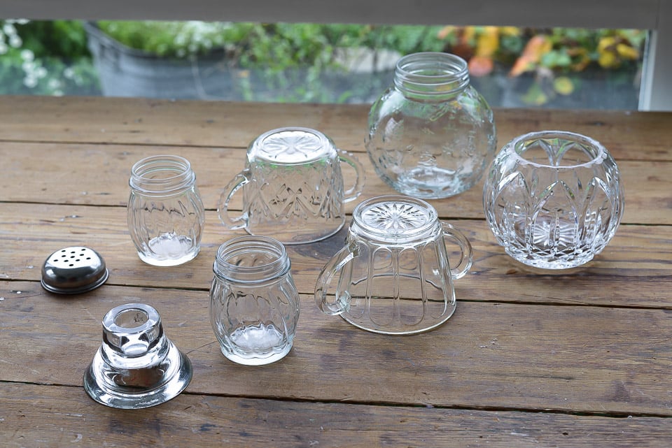 1. Gather up various round glass items that could work for a glass bowl snowman, such as: bowls, jars, sugar bowls, small parmesan cheese shakers, crystal bowls, candle holder.