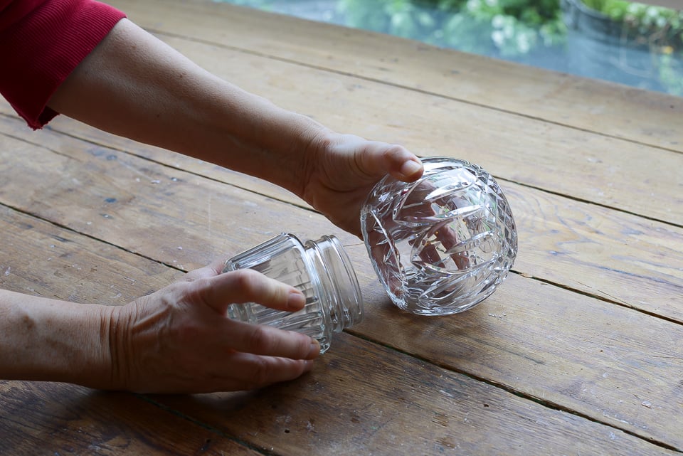 When I chose a small lantern jar with a screw top, I was able to screw it into the opening of a crystal bowl without using glue! Then the head stacked on top, nice and sturdy, so no glue was needed. However, I have already dropped it, watching it roll in sections all over the floor! Luckily, the glass was tough enough to not break. So, using glue is better.