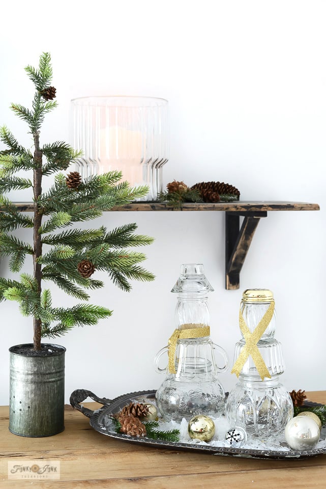 When I shopped the thrift store isles, I was stacking all sorts of glass objects to figure out a good snowman look for scale and uniqueness. It was a fun challenge! I’d bet even a stacked fish bowl snowman could look cool!