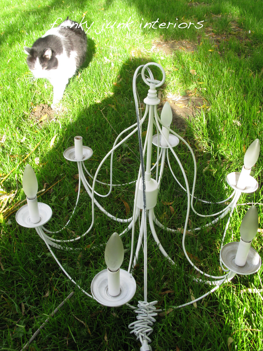 This cute little thrift store found chandelier sat in my garage for nearly 2 years! I didn’t even know if it worked. The electrical part held me back from working with it. So I went for it anyway with my new idea. It was worth a shot!