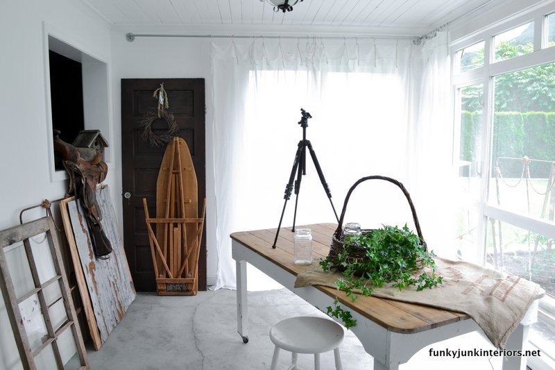 This old farm table once in someone’s garage workshop is the perfect place to stage whatever my heart desires. The rustic wood top is the perfect matte rustic neutral backdrop for most anything. I’ll show you how I change out the table top in a moment.