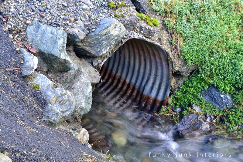 Hey, and step right up for the most amazing ambiance possible! Here’s the perfect sound track while you scroll. 🙂 This one isn’t quite as pretty as mine (yes culverts can be pretty!) but you just can’t have a culvert without the water turned on.