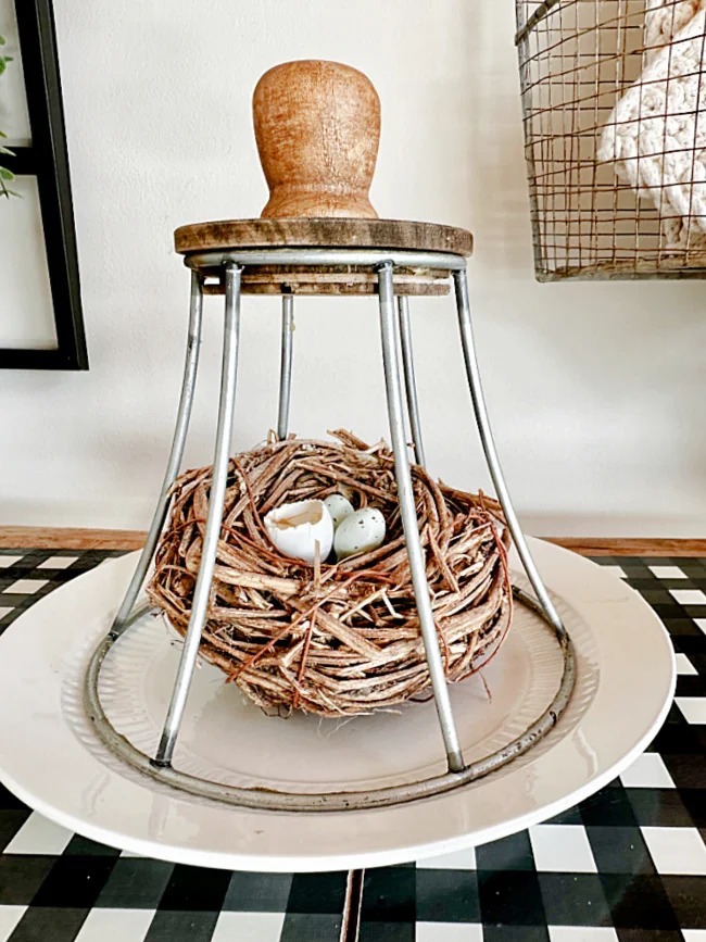 Keep your eyes open for a small lampshade… then team up with a wicker nest to create this adorable bird’s nest cloche that is all too perfect for spring decorating! Love the industrial vibe that lampshade frame offers!