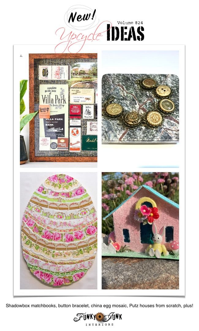 Create 20+ New Upcycle Ideas 824 – Shadowbox matchbook art, brass button bracelet, china Easter egg mosaic, Putz houses from scratch, plus more unique repurposed projects to make with supplies you may already have!