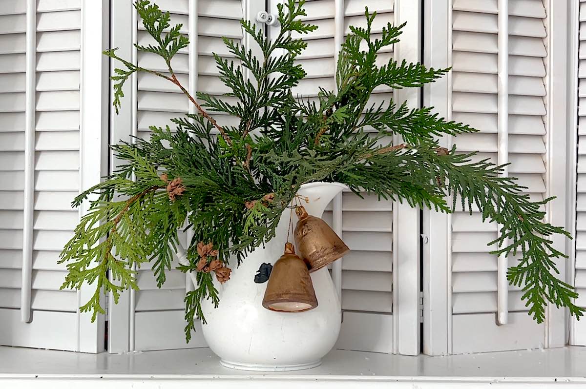 See how cute a couple of china bells look hanging from this jug of fresh evergreen branches?!