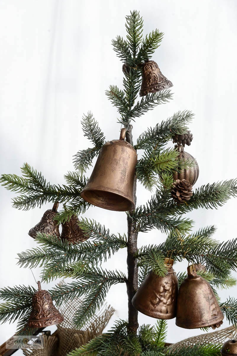 I then pulled out an old ammunition crate, placed a small faux Christmas tree seedling inside, covered the top with a piece of cut burlap, and decked out the tree with all my new favorite antique brass bells and ornaments!