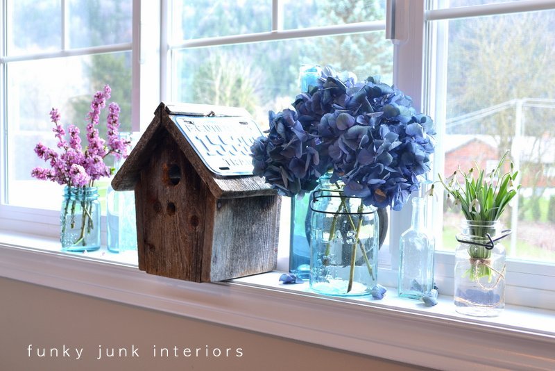 And this little barnwood birdhouse resides on my bedroom windowsill. The added blue licence plate is just a little simple but fun junk styled detail.