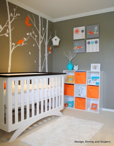 This bird themed nursery wearing untraditional colours is such a fun fresh take! I adore how the trees really give the ceiling height.