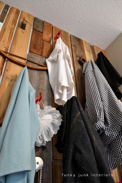 Love the wooden board wall and the funky junky hooks. Love old metal repurposed. Thanks for hosting.