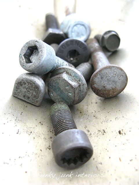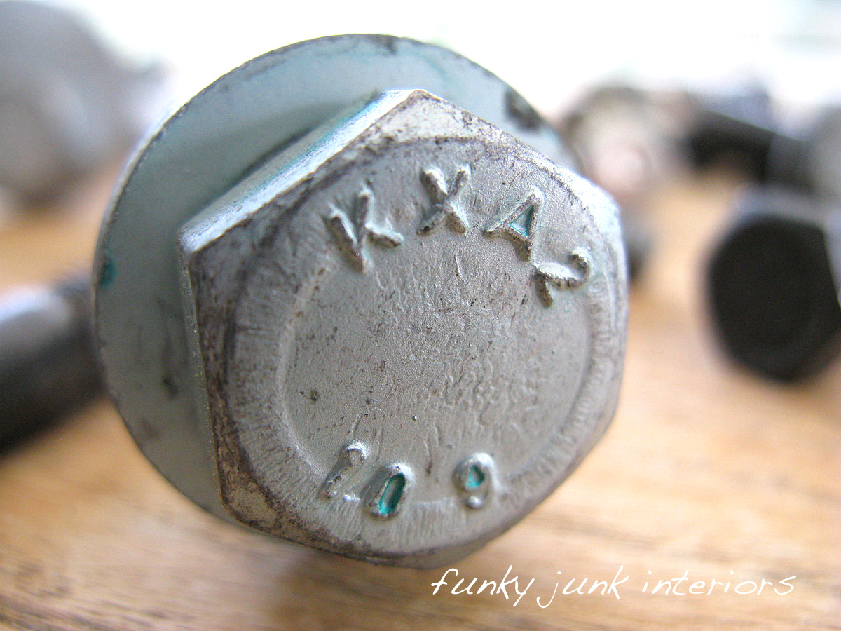 I’m officially starting a bolt revolution. Here and now. You find a bolt, think of me. Wishing I could swoon at the beauty of the crusty metal, faded jewel tones of.. whatever that stuff is, gritty stamped lettering, eclectic shaped heads. Bolts unite!