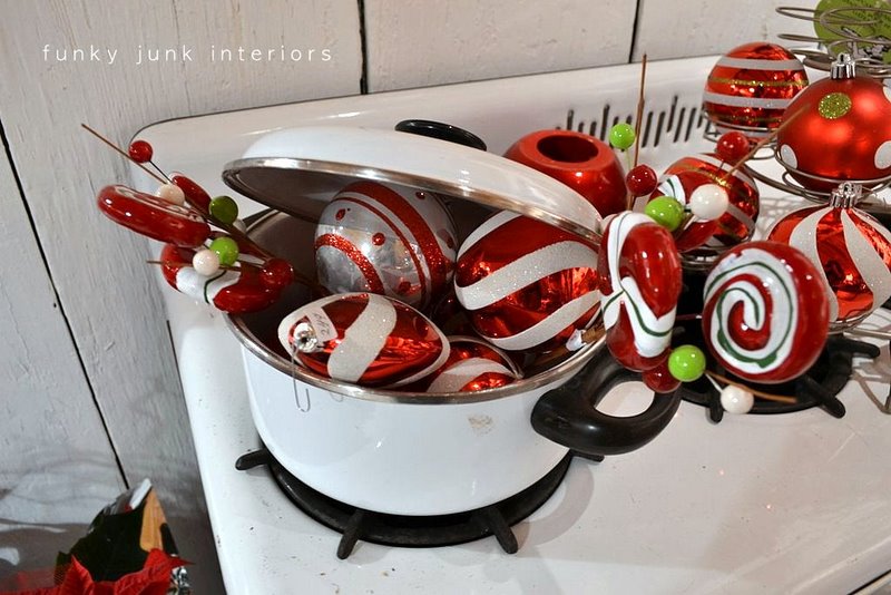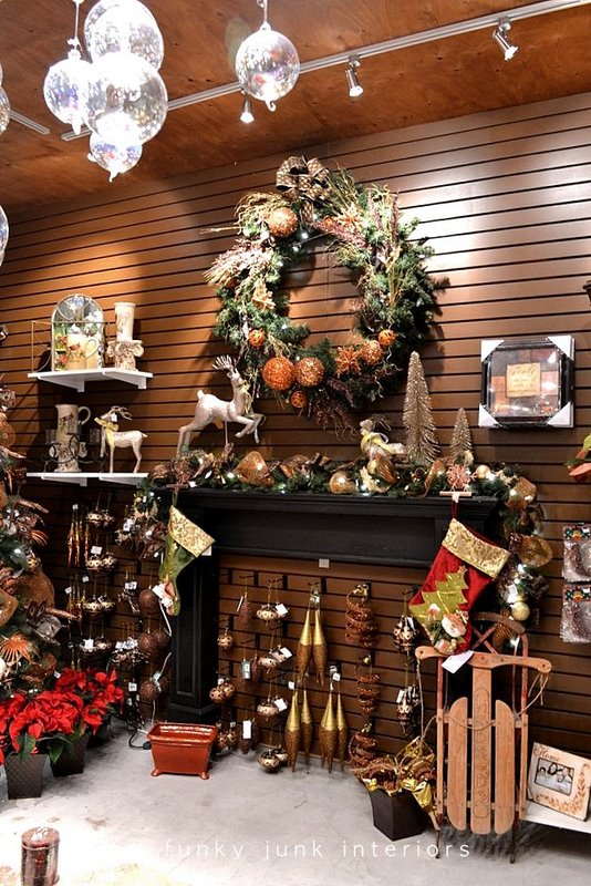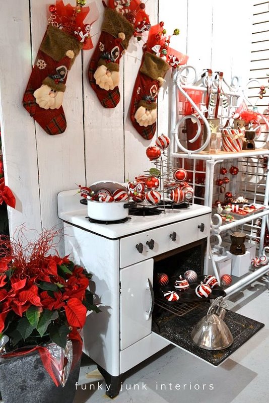 Wow, what a fabulous shop! Not only great items, but great ideas on how to display items! LOVE the kitchen range “dressed” for Christmas and the glittering light of pot lights with glass ornaments! Thanks for posting! Simply beautiful!