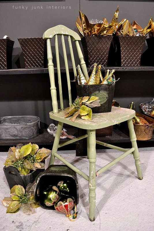 This little green chair made it’s way in and promptly got put to work holding other green related decorations. I placed props along the back wall to bring the items toward you.